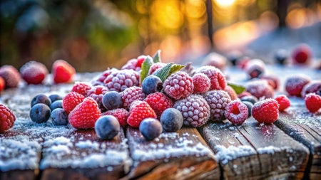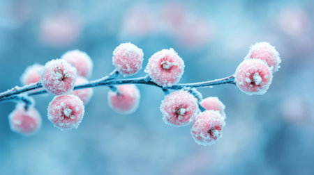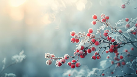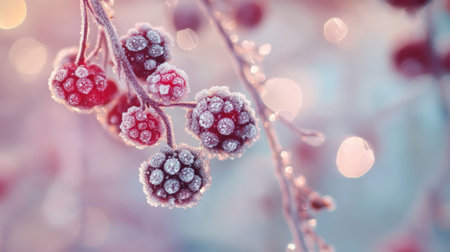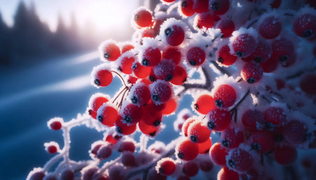 A close-up shot of frost-covered berries at sunrise. The image captures the serene beauty of winter.