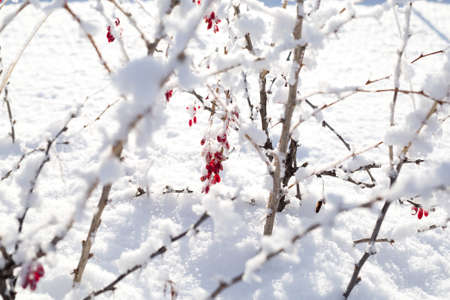Delicate clusters of viburnum berries hang on the branches of a snow-covered tree. Winter food for birds