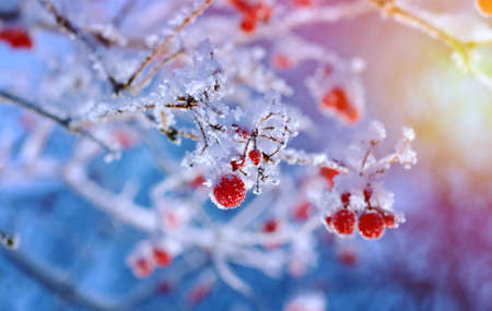 winter frozen rowan berries in nature. selective focus. beauty of winter nature. red frozen berries
