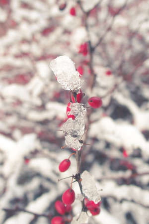Bright red berries covered in fluffy white snow Vintage Retro Filter.