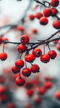 Red berries hanging on a branch. Selective focus and shallow depth of field.