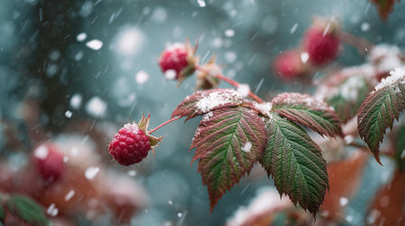 First snow falling gently on Raspberry, a few snowflakes drifting slowly and settling on the leaves; fresh air.