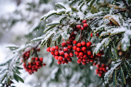 Red berries covered in snow during a winter snowfall. Peaceful and serene winter scene.
