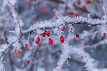 Russia. Kronstadt, January 11, 2022. Picturesque winter view of barberry berries covered with frost.