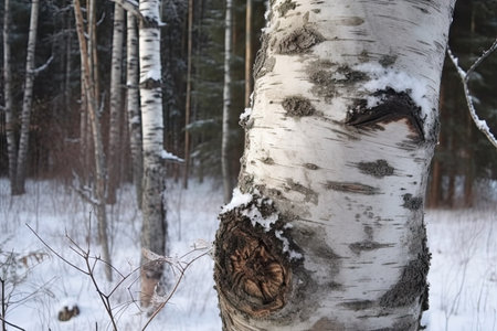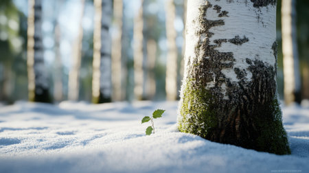 Close-up of birch bark texture in a snow-covered forest scene, cool tones and calm ambiance