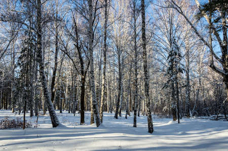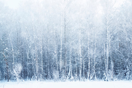 Snowy woods of birch, winter season, horizontal frame.