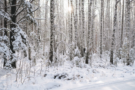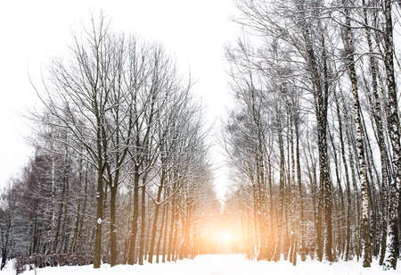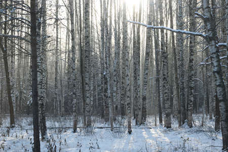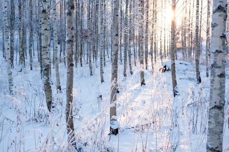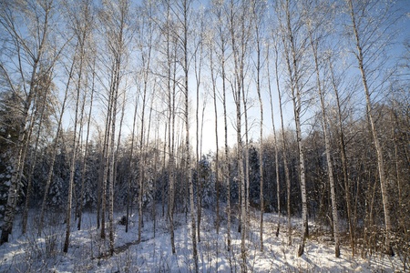 Snowy birch forest and sun light