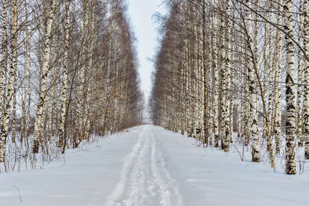 Winter birch grove with alley in sunny day.