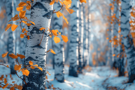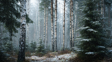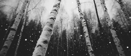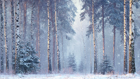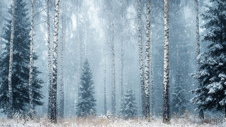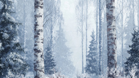 Winter tranquility in a birch forest with gentle snowfall creating a serene atmosphere