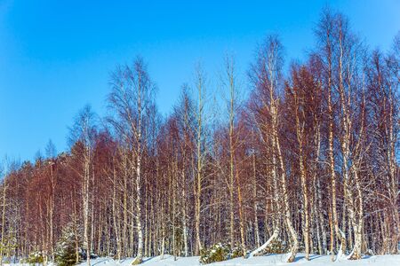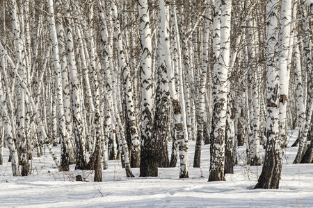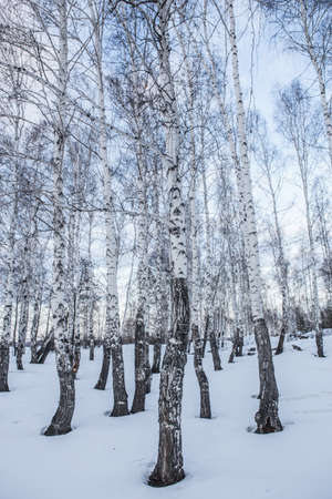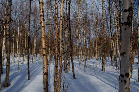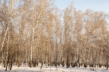 Birch grove in the winter day, nobody