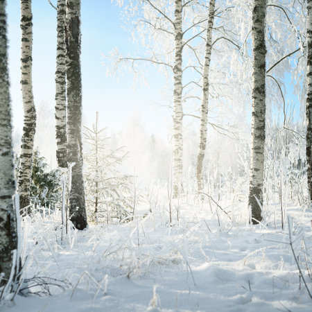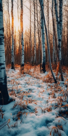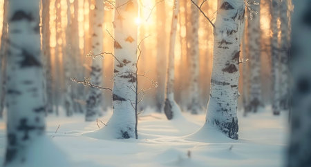 Sunlight filters through tall birch trees blanketed in fresh snow, casting a warm glow over the winter landscape at dawn, creating a serene atmosphere in the frosty forest.