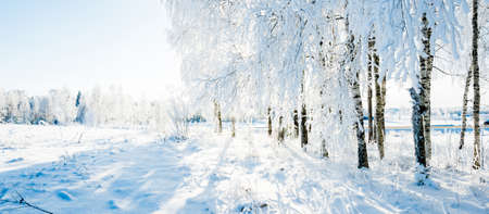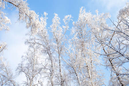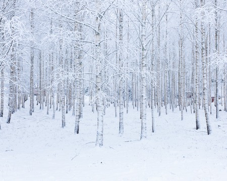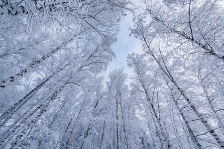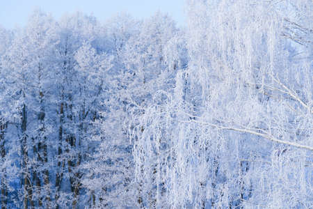Frozen birch forest landscape. Early winter landscape with frost on birch trees.