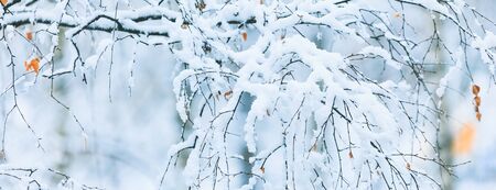 Tree birch trunks and branches under the snow in the winter forest.
