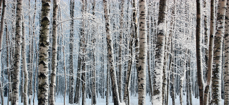 birch forest in winter with snow, panoramic view