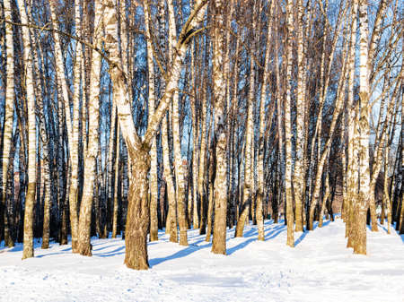 birch grove lit by sun in snow-covered city park on sunny winter day
