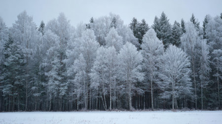 Dense, wintry forest edge where deciduous trees are heavily coated in white frost, contrasting with the darker evergreen trees behind them. A flat, snow-covered field lies in the foreground under a pale, diffused sky, suggesting a very cold morning or late afternoon in a northern climate.