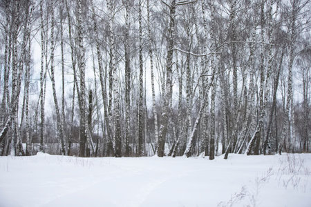 A birch grove covered with white snow. forest in winter.