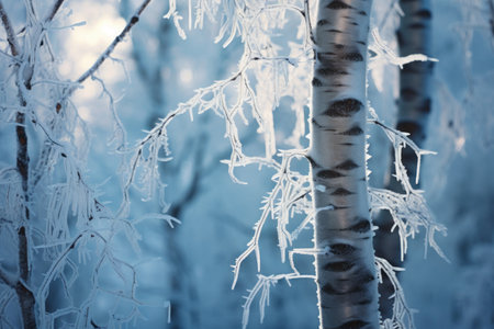 Generative AI : Winter tops of birches are covered with hoarfrost Beautiful birchtrees in winter in the snow against the blue sky at dawn