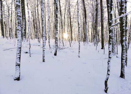 Winter birch forest in the evening at sunset