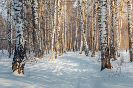 Close-up of birch tree trunks in a serene winter landscape with snow covering the ground and reflecting natural light