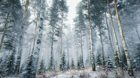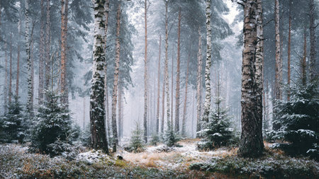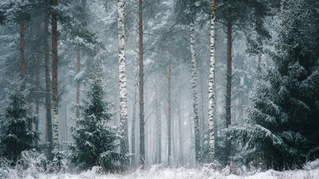 Snow-covered birch and pine trees in a misty forest during snowfall.