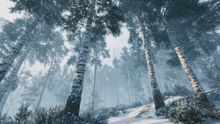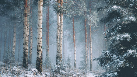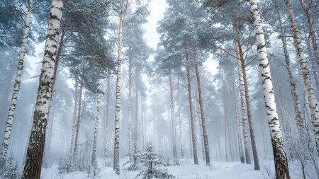 Enchanting winter scene featuring snow-covered birch trees with distinctive white bark emerging through soft morning mist, creating a dreamlike atmospheric landscape perfect for seasonal campaigns.