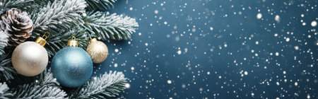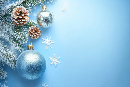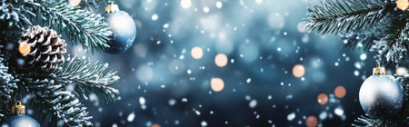 Frosted pine branches, teal and silver ornaments creating a festive winter holiday background