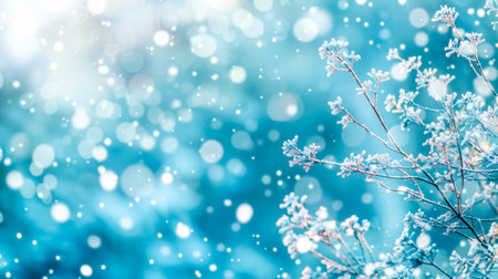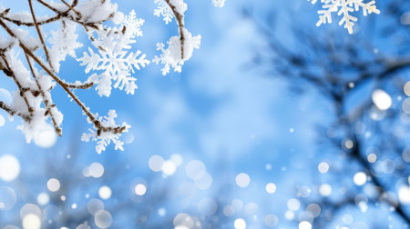 Captivating winter scene featuring delicate snowflakes resting on branches against a soft blue background. The image is enhanced by glowing bokeh lights, creating a serene and magical atmosphere perfect for seasonal themes.