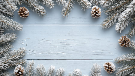 Christmas background with fir tree branches, cones and snow on blue wooden board Generative AI