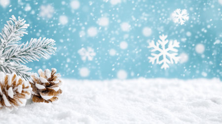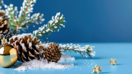 This charming winter composition features pine cones, greenery, a gold ornament, and artificial snow on a serene blue background, perfect for festive decor.