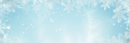 showcases a soft and ethereal winter background featuring delicate snowflakes and frosted branches. The scene is dominated by a soft blue hue, creating a serene and tranquil atmosphere. The snowflakes are intricately detailed, adding a sense of depth and texture to the frosted branches frame the of the enhancing the wintery feel. The overall composition is calm and peaceful, evoking the beauty of a winter wonderland.