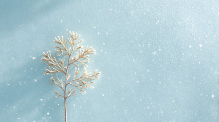 Minimalistic frosted branch on light blue background with falling snow and winter ambiance