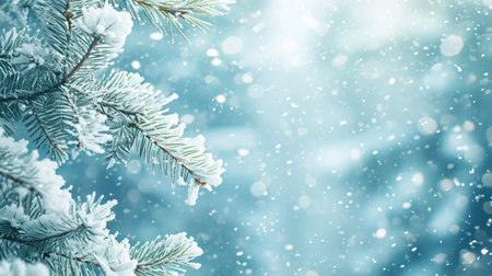 A wintertime backdrop featuring a snowy spruce branch, copy space.