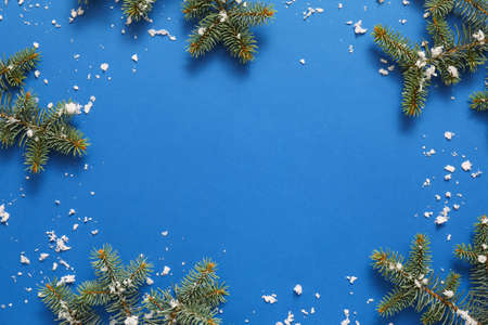 Christmas background. Fir branches covered with snow on blue wooden board. Top view with copy space
