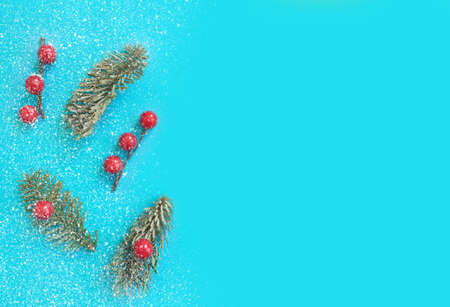 Top view photo of christmas decorations snow branches with red berries and pine cones on isolated pastel blue background with copyspace