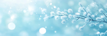 A close-up image of frosty pine branches creates a serene frame against a soft blue background. The delicate ice coating adds a wintry charm, perfect for seasonal themes.