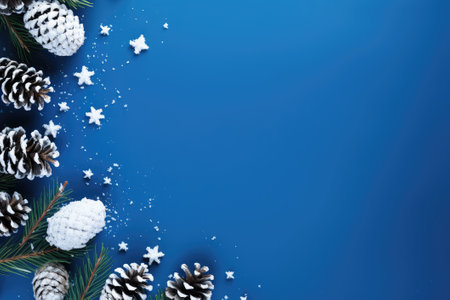 Navy Blue Festive Background, Cool Blue Snowflakes, Pine Cones, Winter Holiday Season Decoration