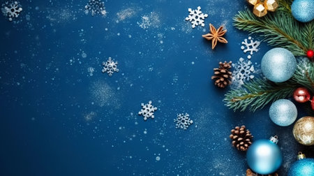 Christmas flat lay with pine, confetti and balls, on blue background with copy space. Top view. Generative AI.