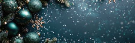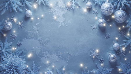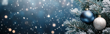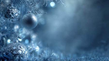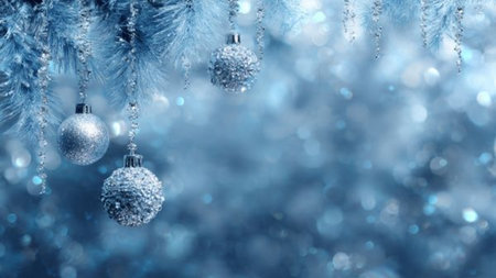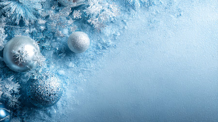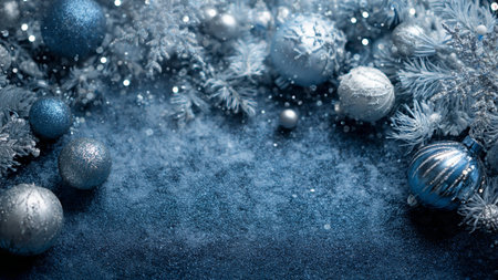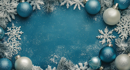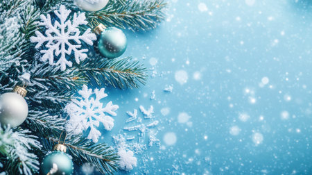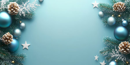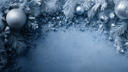 Frosted pine branches, teal and silver ornaments creating a festive winter holiday background