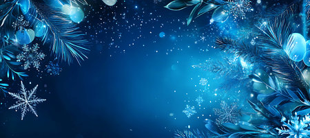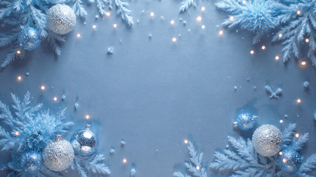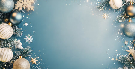 Bright and cheerful blue Christmas background with decorations, providing ample advertising space.