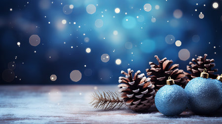Christmas background with blue baubles, pine cones and bokeh. Beautiful christmas card