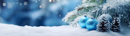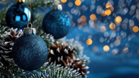 Beautiful close-up of blue Christmas ornaments hanging on a snowy pine tree, surrounded by soft bokeh lights, creating a festive and joyful atmosphere.