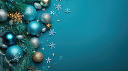 teal shades festive background with spruce branches and baubles. Winter holidays theme abstract backdrop
