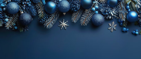 A festive arrangement of blue and silver Christmas baubles and pine branches on a deep blue surface, creating a sophisticated holiday theme.