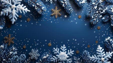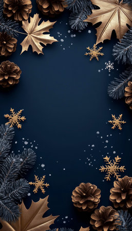 An artistic display showcases golden leaves, pinecones, and delicate snowflakes scattered against a rich dark blue backdrop, creating a festive and inviting atmosphere perfect for winter decor.