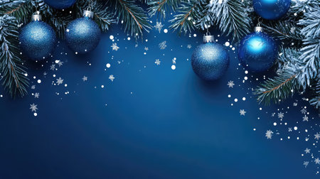 Blue Christmas ornaments, pine branches, and snowflakes decorate a dark blue background.