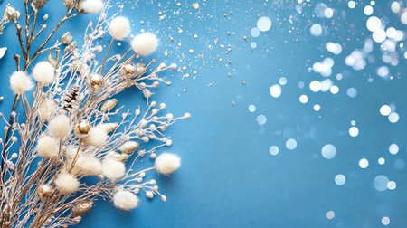 This captivating winter arrangement showcases soft flowers and gold accents set against a serene blue background, creating a magical and festive atmosphere.