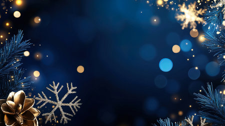 Elegant christmas background with pine branches, golden pinecone and silver snowflake on a festive dark blue backdrop with sparkling bokeh lights