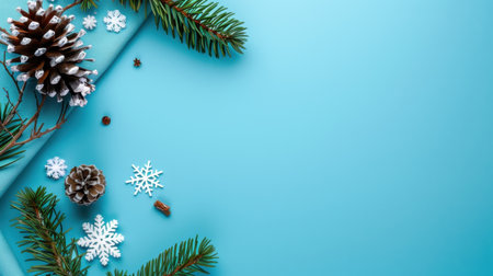 This delightful composition features snowflakes and pine cones arranged artfully around lush evergreen branches on a vibrant turquoise background, evoking a festive atmosphere.