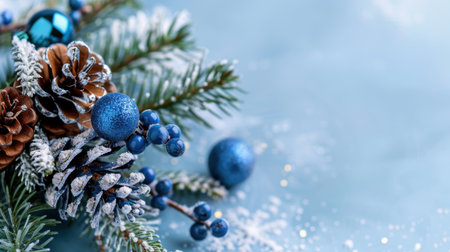 This beautiful festive arrangement showcases pine cones, blue berries, and Christmas ornaments resting gracefully on a soft icy background, creating a perfect seasonal vibe.